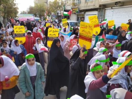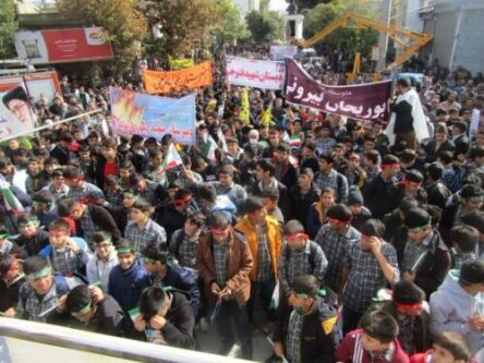 سرود خوانی دانش‌آموزان در راهپیمایی ۱۳ آبان‌