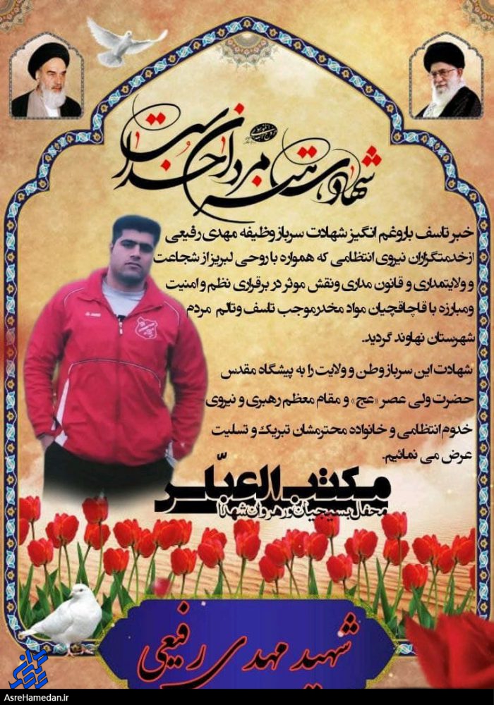 سرباز وظیفه شهید مهدی رفیعی شب گذشته در درگیری با سوداگران مرگ و مخلان امنیت پس از اصابت گلوله به علت شدت جراحات آسمانی شد.