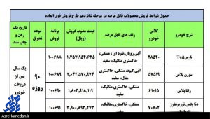 خودروهای ارائه شده در این طرح شامل پژو پارس TU5 ، سورن پلاس ،رانا پلاس، دنا پلاس توربو شارژ اتوماتیک وبا قیمت قطعی بوده و موعد تحویل خودروها حداکثر۳ ماهه خواهد بود.