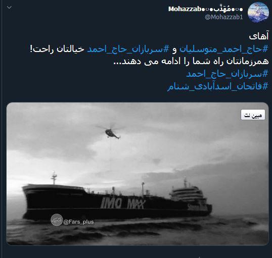 یکی هم با انتشار از عکس کشتی توقیف شده انگلیس توییت زده بود که سربازان حاج احمد خیالتان راحت! همرزمانتان ادامه دهنده راهتان هستند .